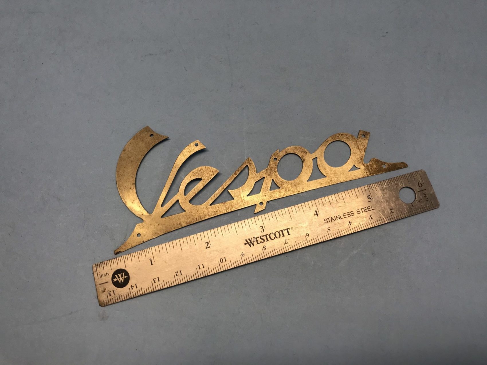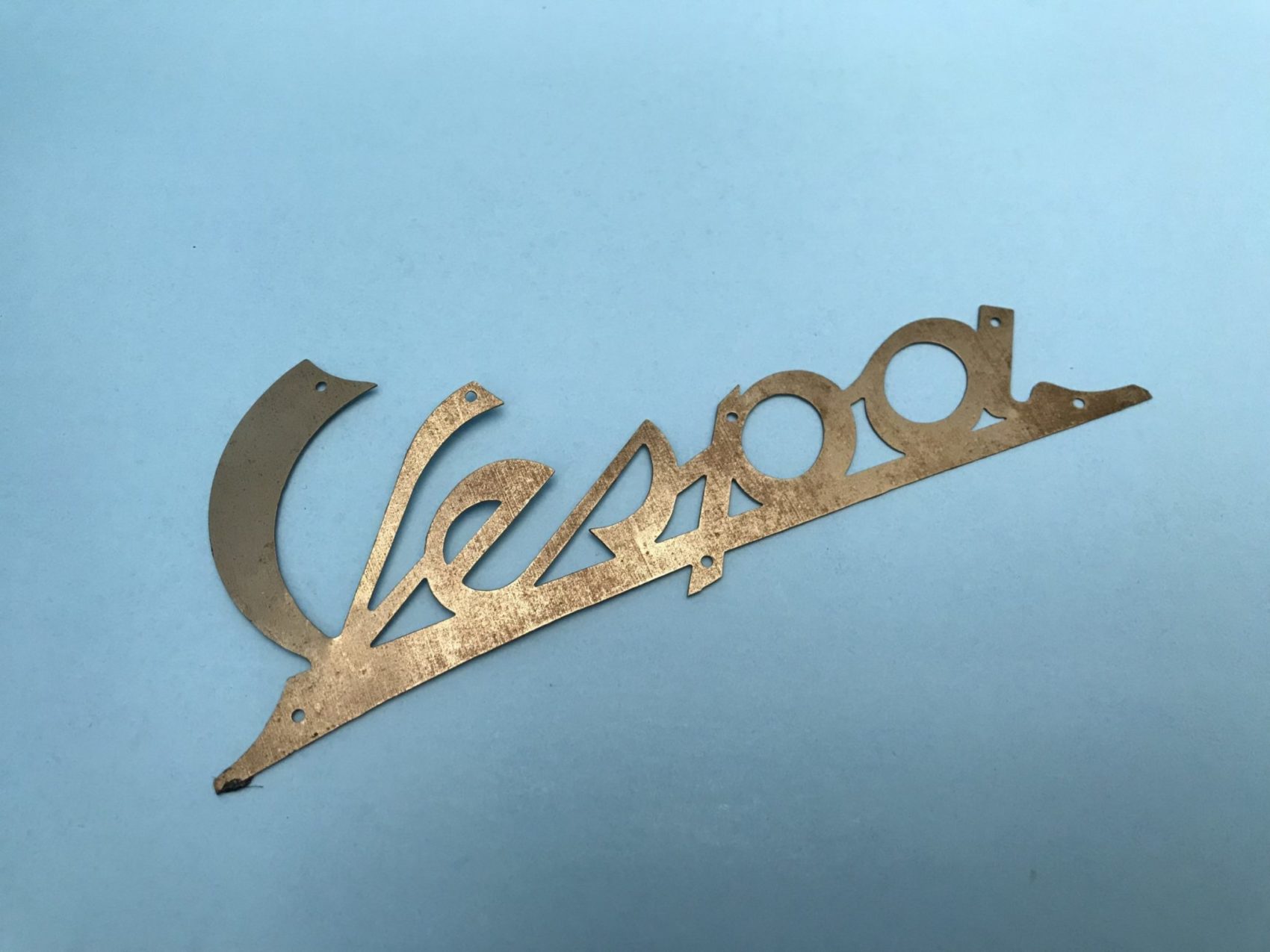 Vespa leg shield script badge for 1950s models. We think its for VNA Vespa 125 but may work on other models. Check measurement on holes before buying. Only 1 in stock. Had this for years can’t even remember if its NOS or Remade… but looks quality. Has a bit of flash rust but may clean up.